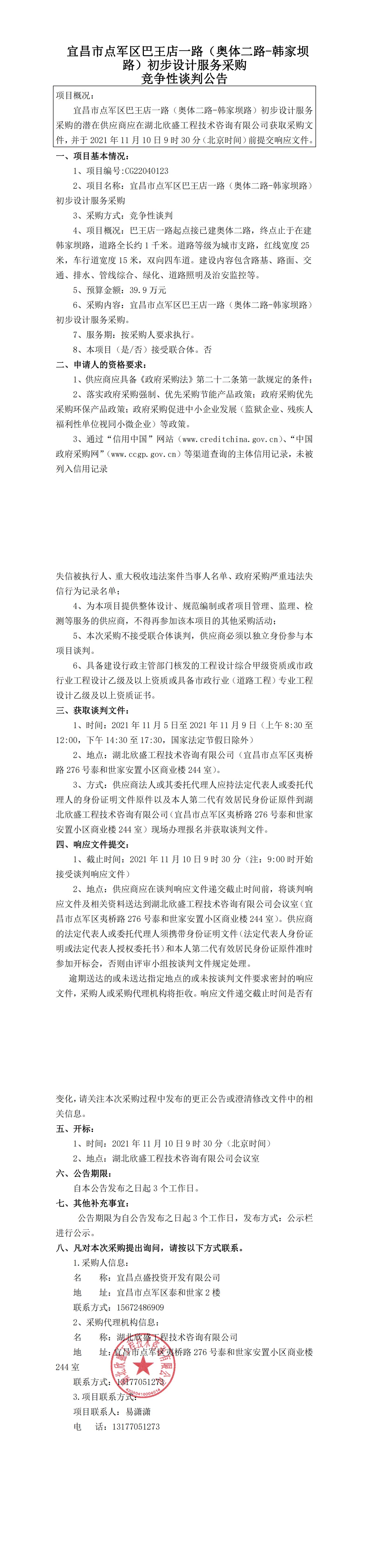 宜昌市點(diǎn)軍區(qū)巴王店一路(奧體二路-韓家壩路)初步設(shè)計(jì)服務(wù)采購競爭性談判公告