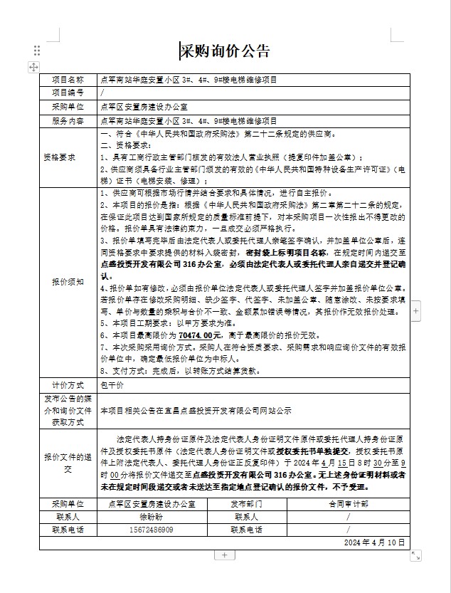 點(diǎn)軍南站華庭安置小區(qū)3#、4#、9#樓電梯維修項(xiàng)目詢價(jià)公告