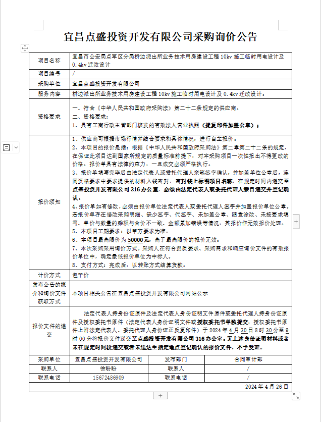 宜昌市公安局點軍區(qū)分局橋邊派出所業(yè)務(wù)技術(shù)用房建設(shè)工程10kv施工臨時用電設(shè)計及0.4kv遷改設(shè)計詢價公告