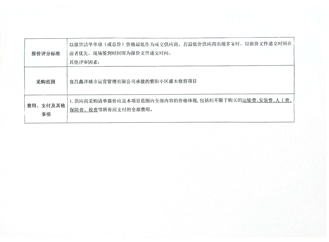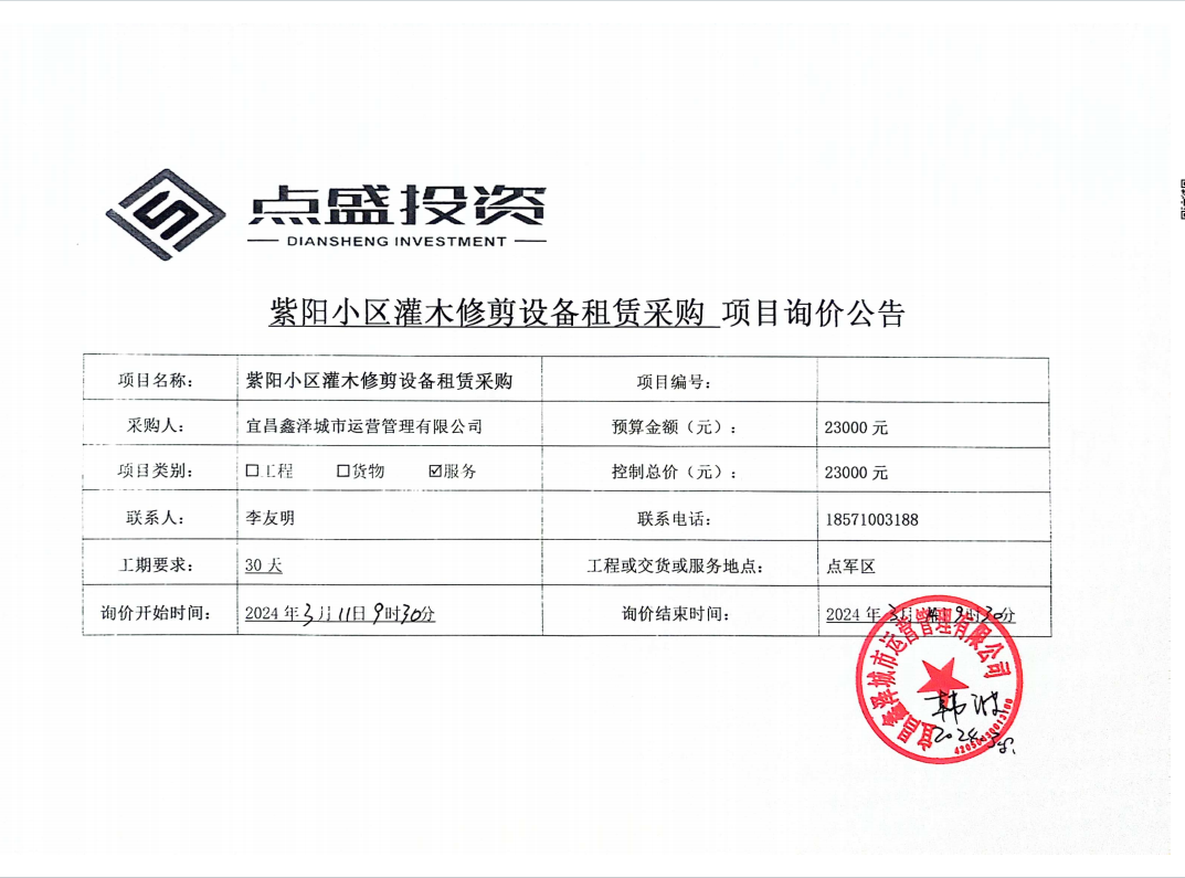 宜昌鑫澤城市運(yùn)營(yíng)管理有限公司管紫陽(yáng)小區(qū)灌木修剪設(shè)備租賃采購(gòu)項(xiàng)目詢價(jià)公告