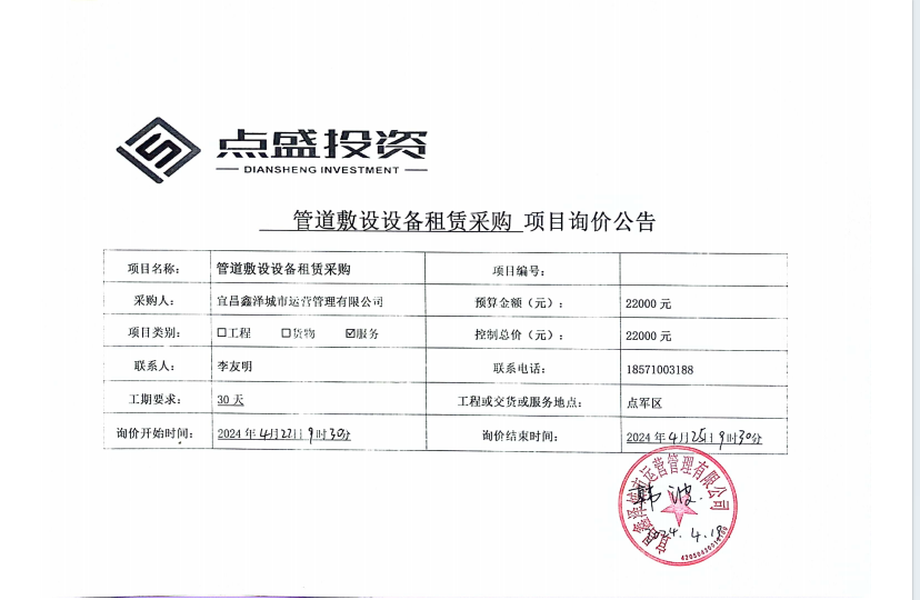 宜昌鑫澤城市運營管理有限公司管道敷設設備租賃采購項目詢價公告