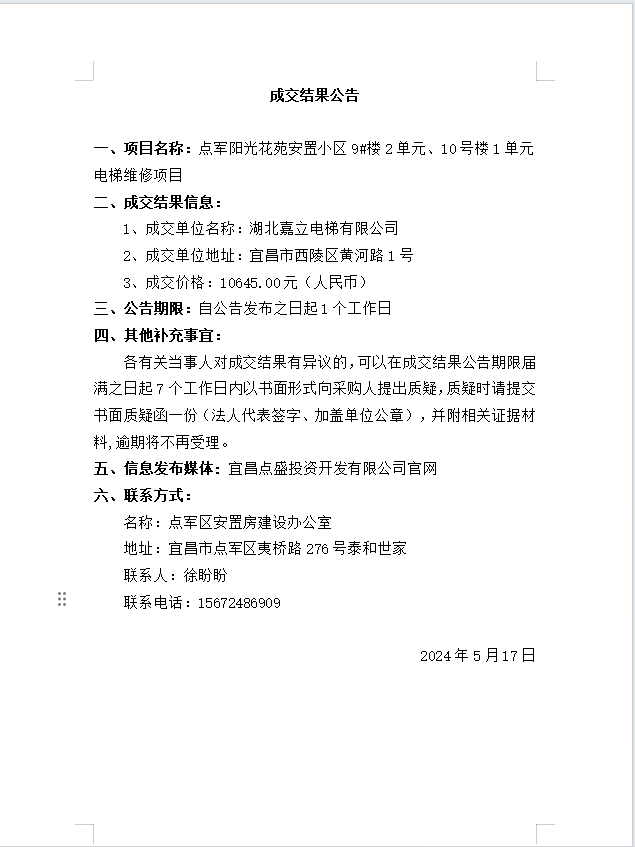點(diǎn)軍陽光花苑安置小區(qū)9#樓2單元、10號(hào)樓1單元電梯維修項(xiàng)目成交公告