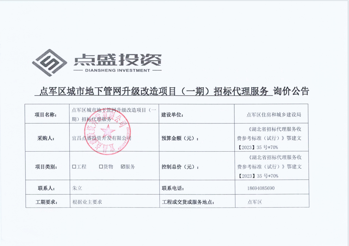 點軍區(qū)城市地下管網(wǎng)升級改造項目(一期)招標代理服務 詢價公告