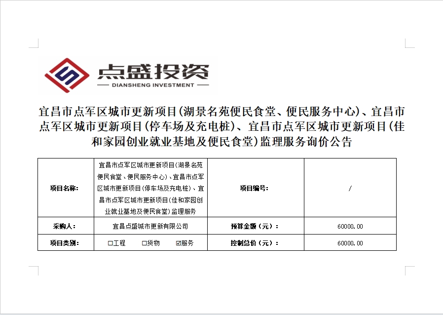 宜昌市點軍區(qū)城市更新項目(湖景名苑便民食堂、便民服務(wù)中心)、宜昌市點軍區(qū)城市更新項目(停車場及充電樁)、宜昌市點軍區(qū)城市更新項目(佳和家園創(chuàng)業(yè)就業(yè)基地及便民食堂)監(jiān)理服務(wù)詢價公告