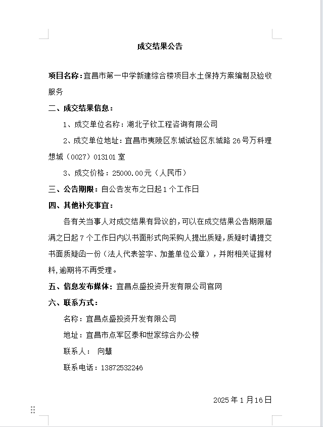 宜昌市第一中學(xué)新建綜合樓項(xiàng)目水土保持方案編制及驗(yàn)收服務(wù)成交公告