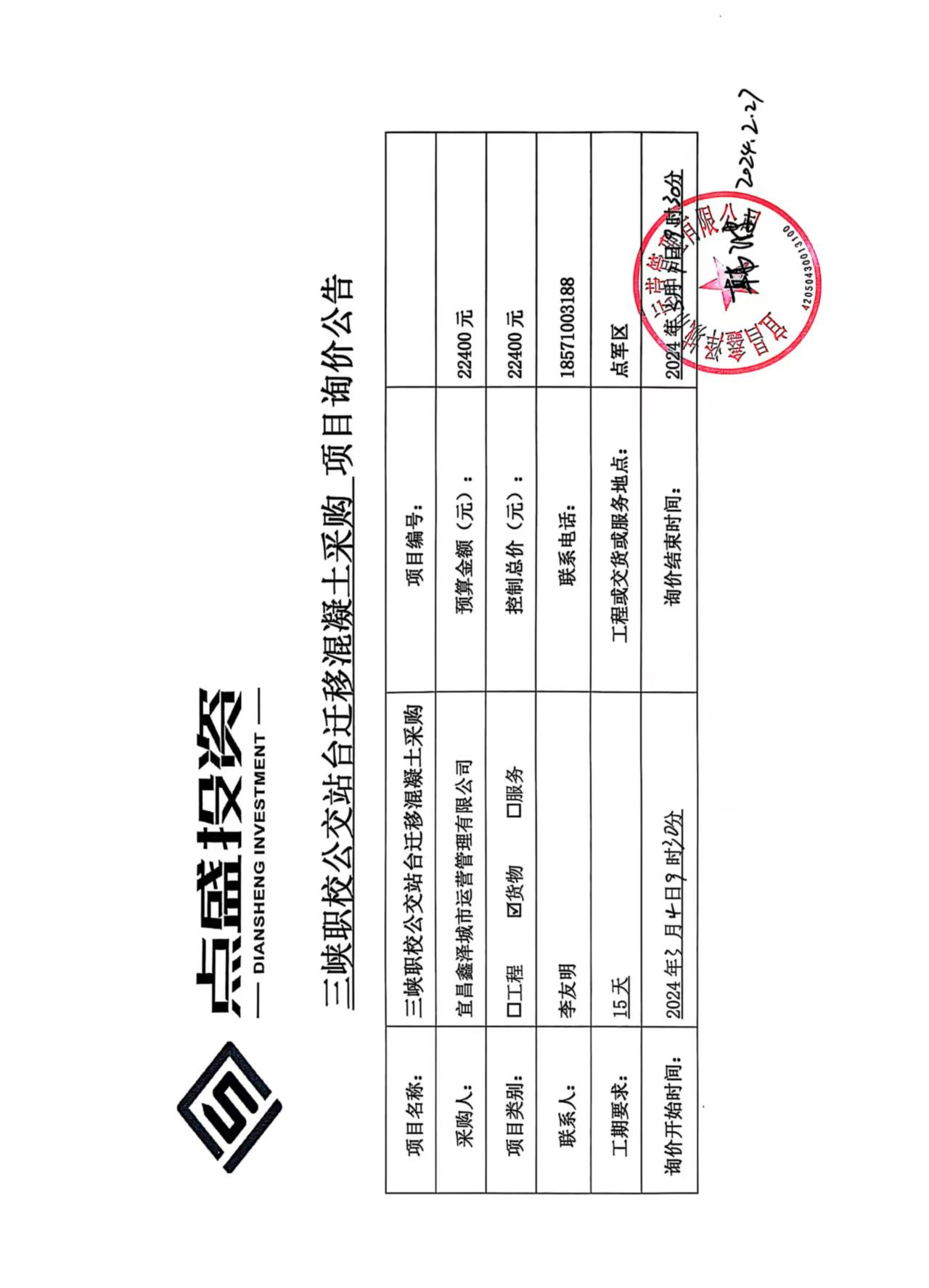 三峽職校公交站臺遷移混凝土采購詢價公告