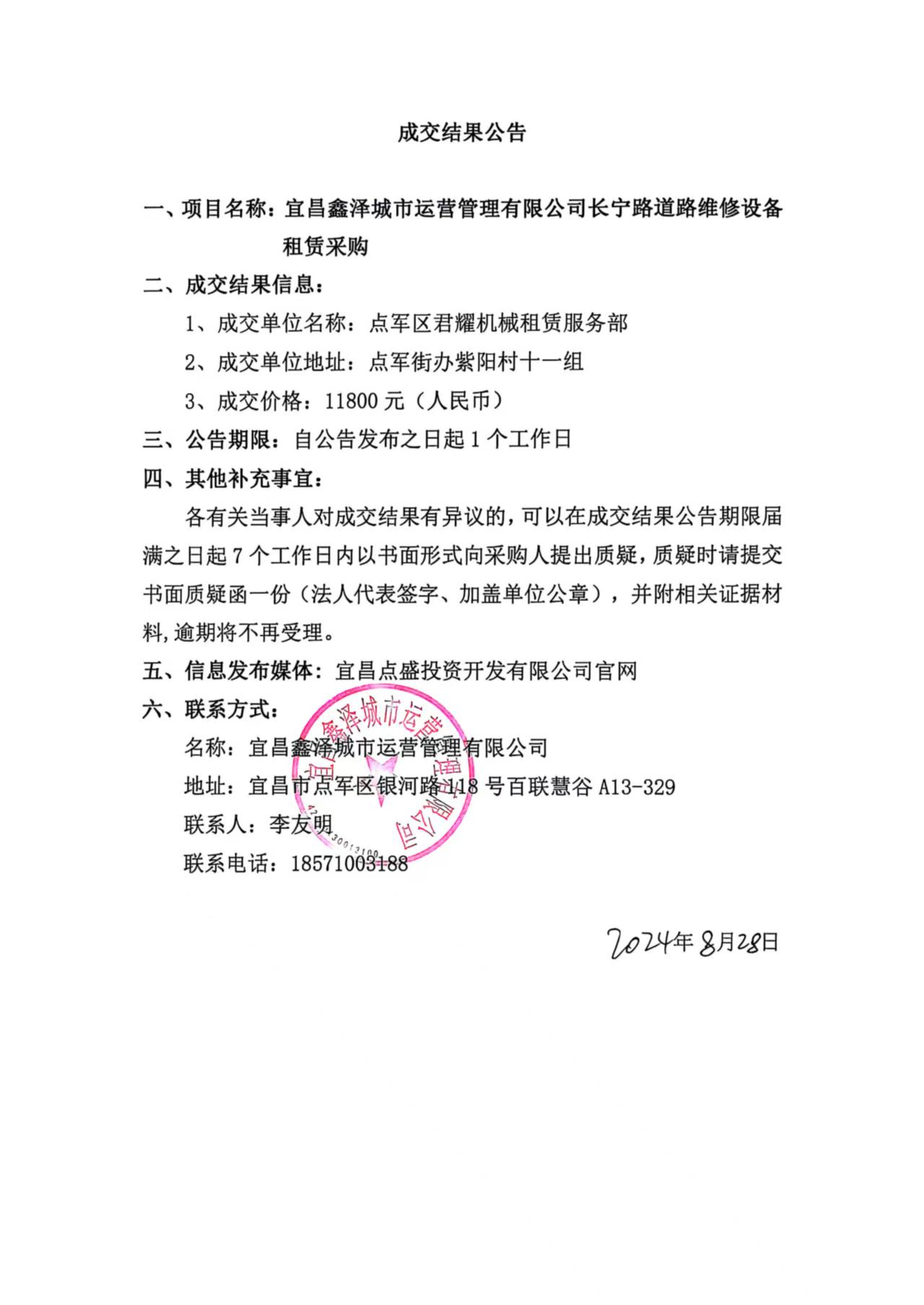長寧路道路維修設(shè)備租賃采購成交公告